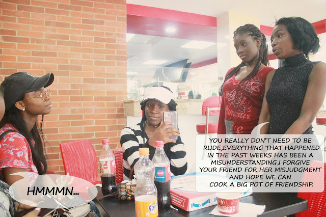 Priscilla and Peace were still laughing at Favour's reply and so was Karmsi and i. We all didn't expect to hear that from her. Laughing and giggling like nothing had gone wrong.